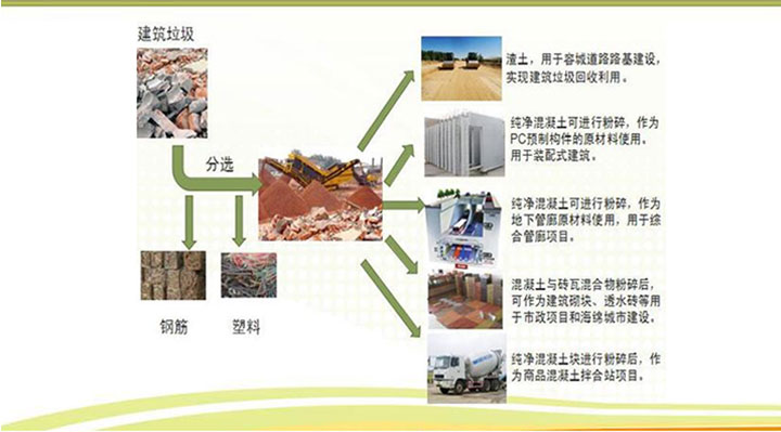 建筑垃圾處理,是將固體廢棄物作為再生資源重新利用的一種方式。建筑垃圾中的許多廢棄物經(jīng)分揀、剔除或粉碎后,大多可以作為再生資源重新利用如:廢鋼筋、廢鐵絲、廢電線和各種廢鋼配件等金屬,經(jīng)分揀、集中、重新回爐后,可以再加工制成各種規(guī)格的鋼材;廢竹木材則可以用于制造人造木材;磚、石、混凝土等廢料經(jīng)粉碎后,可以代砂,用于砌筑砂漿、抹灰 砂漿、打混凝土墊層等,還可以用于制作砌塊、鋪道磚等建材制品。