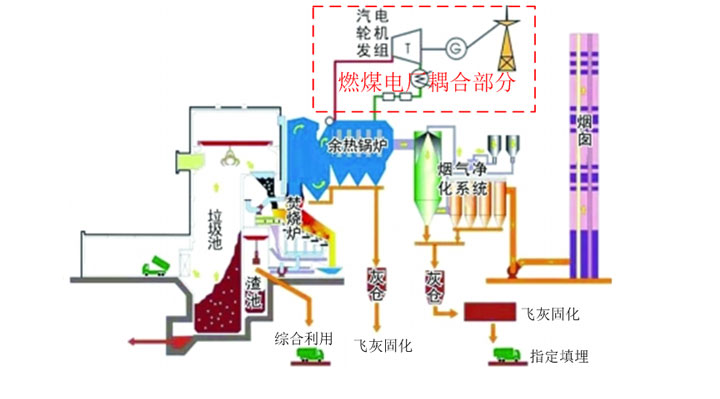 新建垃圾焚燒線,通過(guò)余熱鍋爐產(chǎn)生的蒸汽進(jìn)入燃煤電廠熱力系統(tǒng)耦合發(fā)電,不新建汽輪發(fā)電機(jī)組及輔助設(shè)備,只配置除氧給水、回?zé)岬认到y(tǒng),同步建設(shè)脫硫、脫硝、除塵、二噁英及垃圾滲濾液處理等環(huán)保治理設(shè)施。